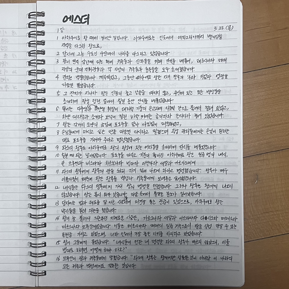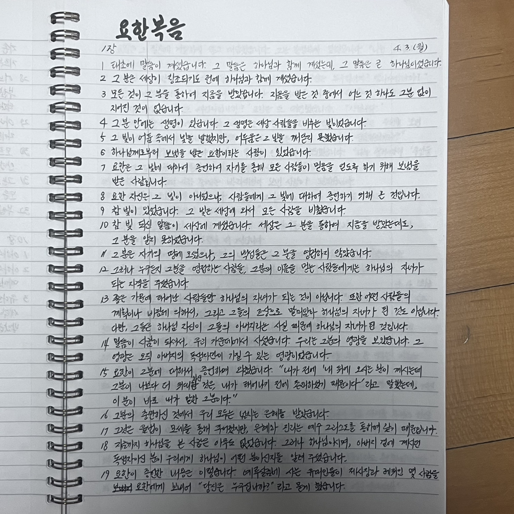 매일 성경 한 장, 또는 양이 조금 많으면 이틀에 한 장을 쓰는 것을 목표로 한다.