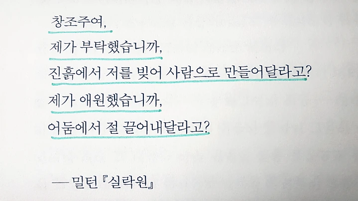 경애가 사무실에 남긴 실락원의 한 구절을 읽는 순간, 고통은 만인의 공통어이자 지극히 주관적인 사건이라는 생각을 했다. 경애는 상수와 다른 방식으로 삶을 그렇게 이겨내 가고 있었다. 저주하고 원망하는 그 삶과 싸워가는 경애와 달리 상수는 자신의 정체성을 외면한 채로 죄가 없다, 는 말로 스스로를 위로하였다.