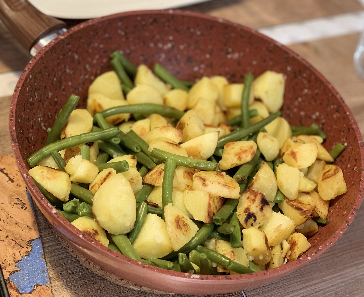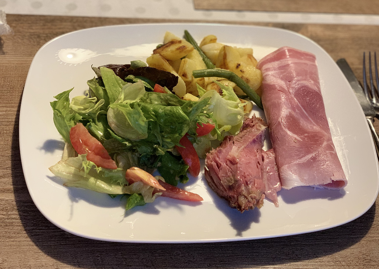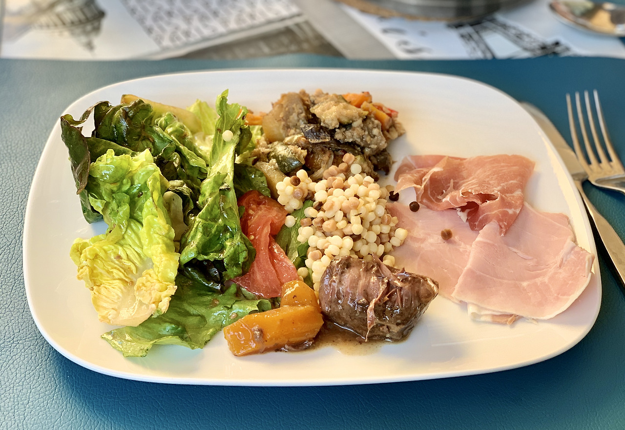 오븐 야채구이, 송아지 고기 스튜, 그리고 동글 파스타, 정봉, 샐러드.
