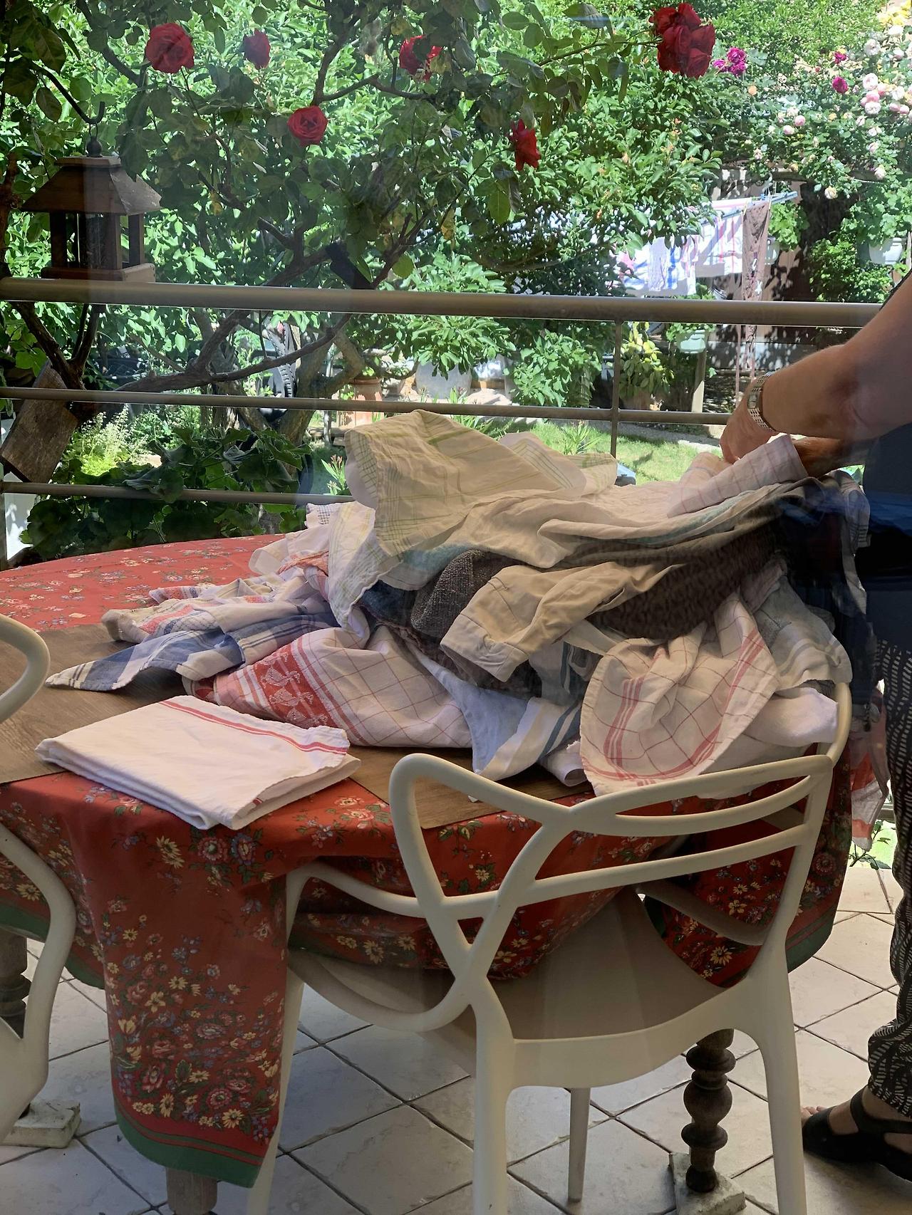 불과 두 시간 만에 몽땅 다 말랐고 모두 테라스로 걷어와서 시어머니와 차곡차곡 개기 시작했다.