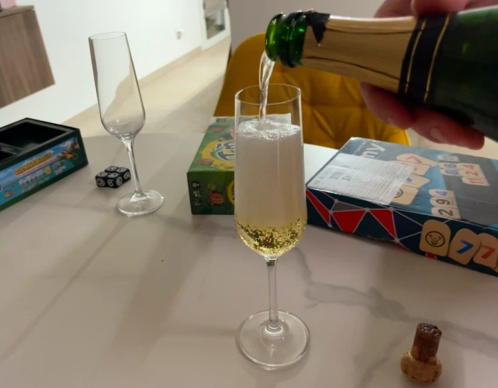 우리 네 사람은 보드게임을 하면서 샴페인을 마셨다.