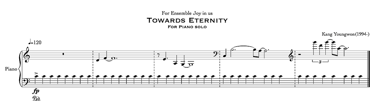 임경진 작곡가가 독일어 제목(platzeit)을 지었다면 강영원 작곡가는 영어로 지었습니다. Towards Eternity, 영원을 향하여. 멋진 제목이군요. 작곡가의 이름도 들어가 있어요. 템포는 4분음표 120입니다. 어느 정도의 빠르기냐면요. 메트로놈 표기는 1분을 기준으로 합니다. 1분이 60초이니까, 4분음표 60은 1초에 4분음표를 한번 친다는 뜻이 됩니다. 그러면 120은 0.5초마다 4분음표를 한 번씩 친다는 의미가 된답니다.