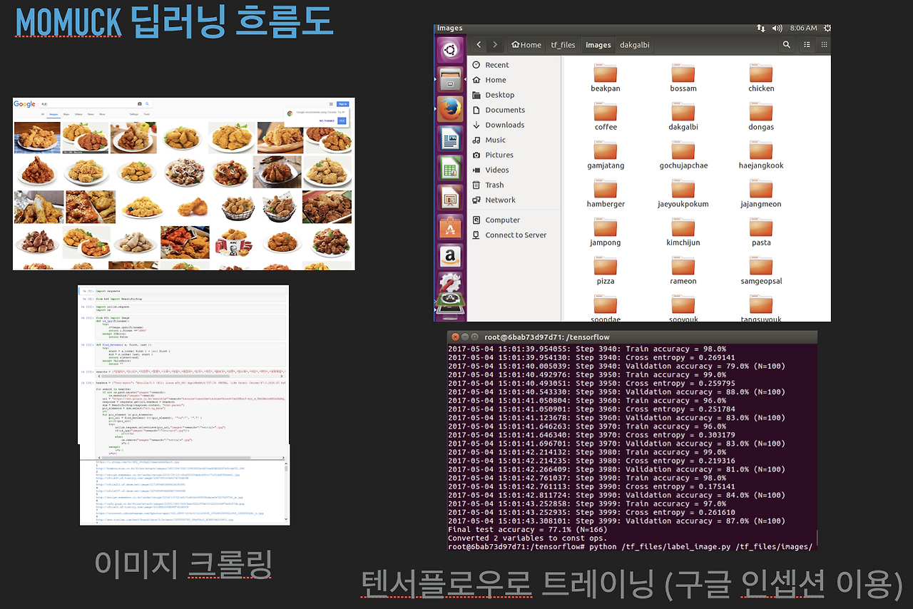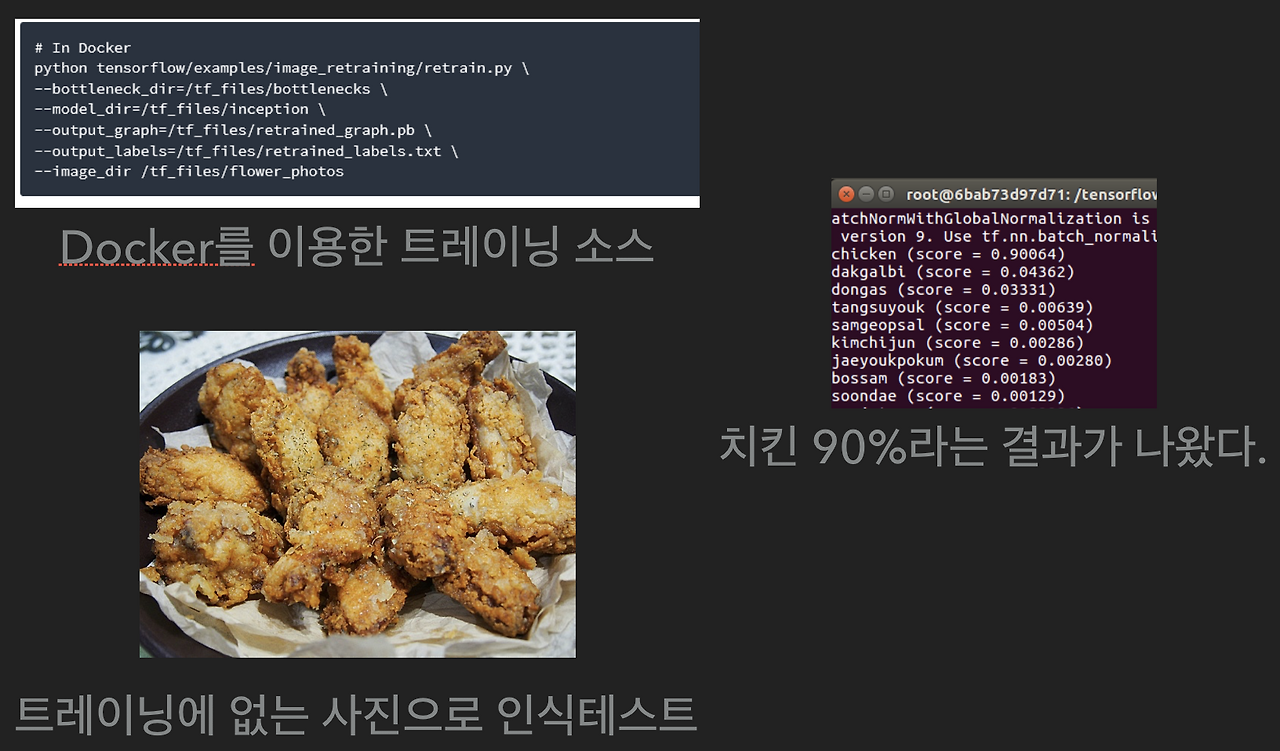 그리고 사진들을 폴더별로 정리한다. 그리고 사용하고 싶은 구조에 따라 조금씩 달라진다. 구조는 다른 글에서 이야기하도록 하고, 여기서는 당시 굉장히 핫한 모델인 인셉션v3 구조를 사용했다. 그 결과는 아래에 있는 사진처럼 치킨을 잘 인식하는 것을 볼 수 있었다.