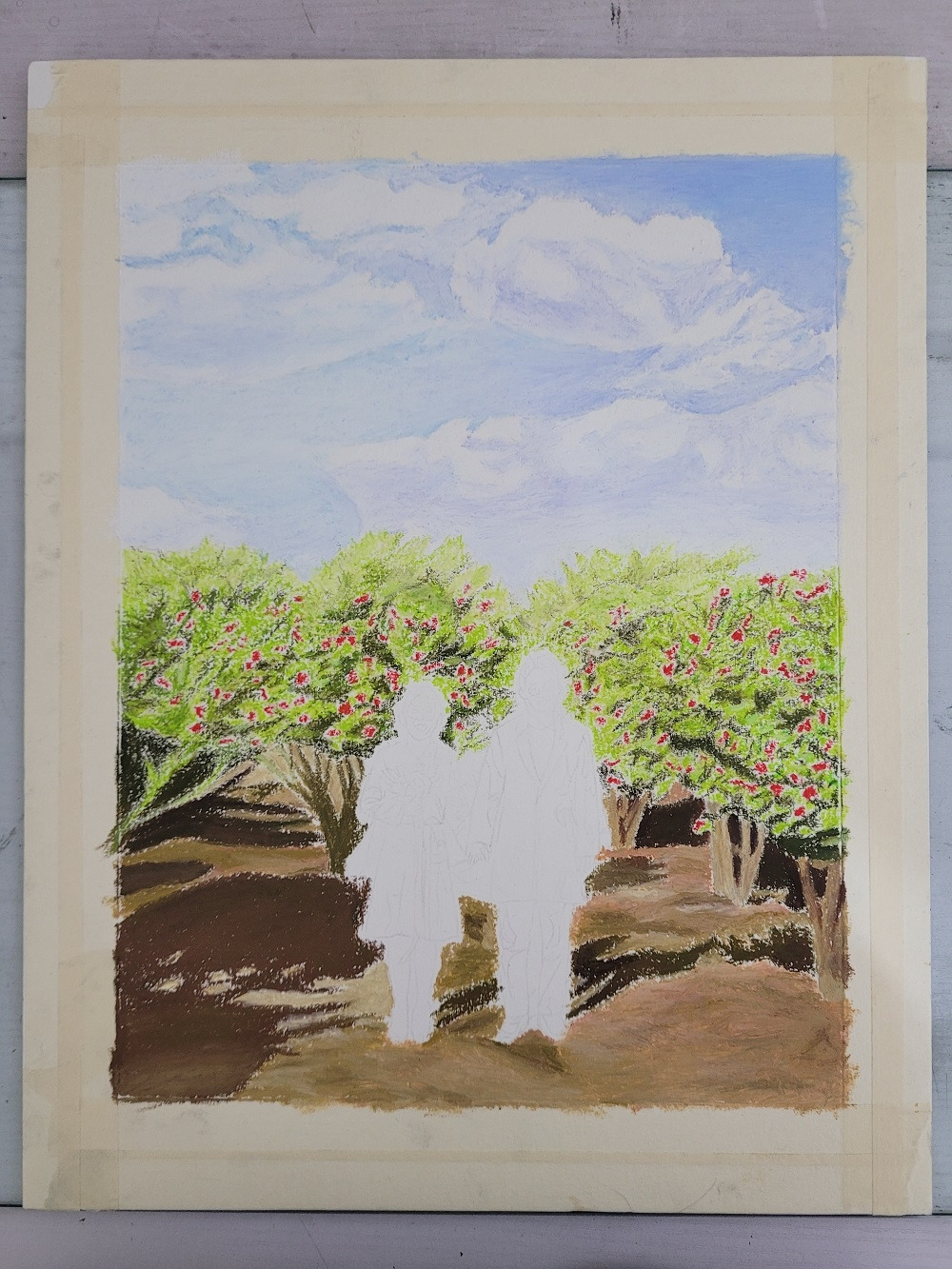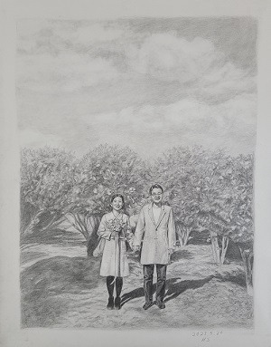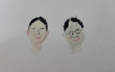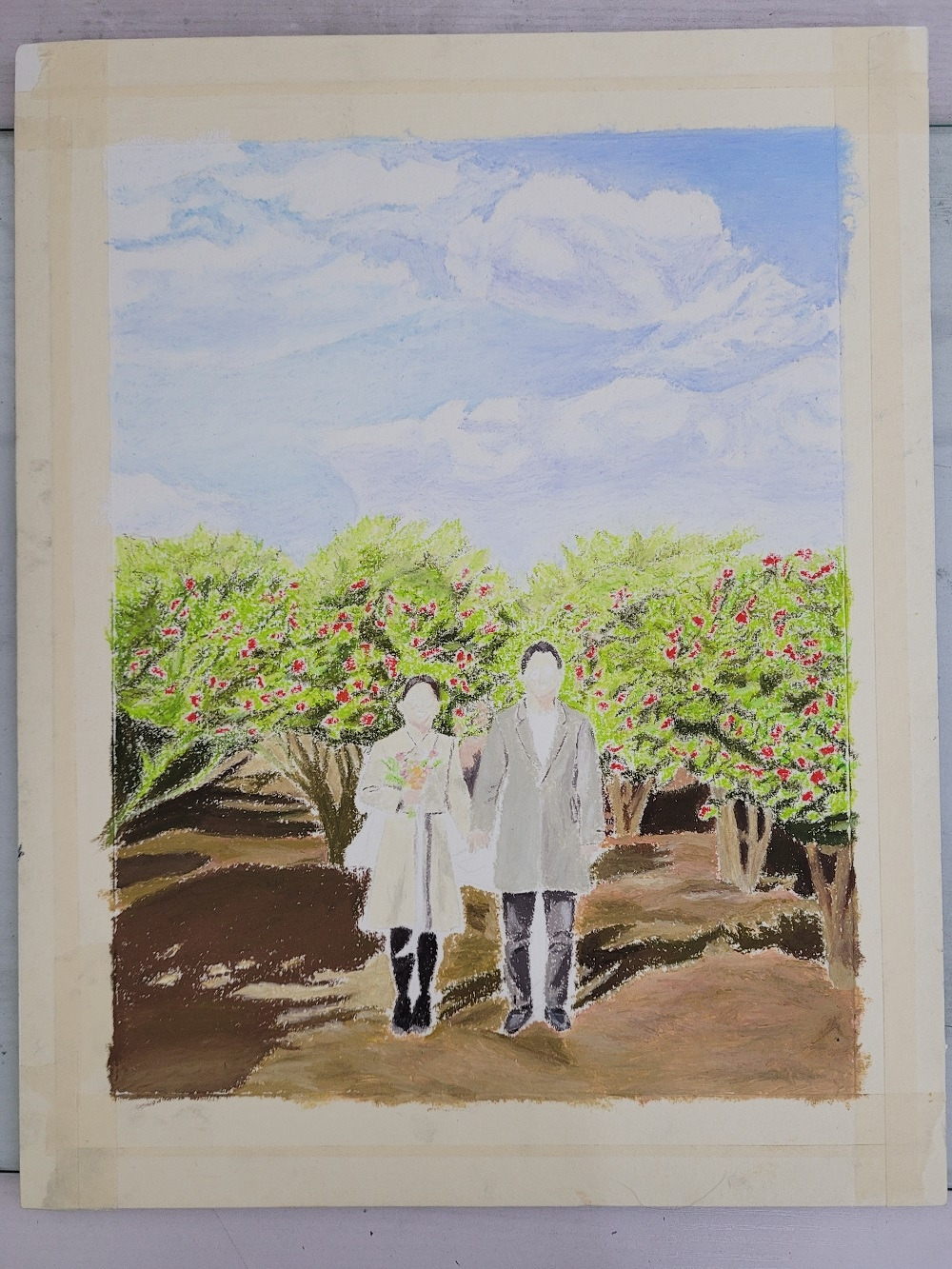 밑그림을 그리면서 쉽지 않았던 게 두 가지 있었다. 첫 번째는 나무, 그리고 두 번째는 '내 얼굴'. 사실 처음 그림을 그리기 시작할 때 가장 걱정했던 부분은 다들 쉽게 짐작할 수 있겠지만, 신부 얼굴을 이상하게 그리면 어떡하지에 대한 두려움이었다. 하지만 애정이 담긴 덕분인지 이외로 짝꿍 얼굴은 생각보다 수월하게 그릴 수 있었던 반면, 내 얼굴은 아무리 고치고 들여다봐도 썩 뭔가 닮지도, 마음에 들게 그려지지도 않는 느낌이었다. 오일 파스텔로는 세부 묘사가 어려웠기에 스케치 또한 그것을 감안해 너무 세밀 묘사는 피하도록 선생님께서 지도하셨지만, 얼굴이 마음에 들지 않는 것이 꼭 묘사가 부족하기 때문 만은 아닌 것 같기도 했다.
