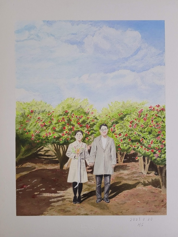 마침 시기가 딱 좋았다. 제주도에서 스냅사진을 찍었기에 그릴 만한 대상이 있었고, 그림을 배우던 그림 스튜디오에서는 이제 정규 커리큘럼을 따라가는 코스를 지나 내가 관심 있는 주제를 택해 그릴 수 있는 코스에 진입하기도 했다. 그 코스의 첫 번째 그림으로서 셀프 청첩장을 그린다는 것은 무척 멋진 일이 아닐까.
