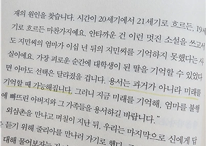 "용서는 과거가 아니라 미래를 기억할 때 가능해집니다. 그러니 미래를 기억해, 엄마를 불행에 빠뜨린 아버지와 그 가족들을 용서하길 바랍니다." p.30