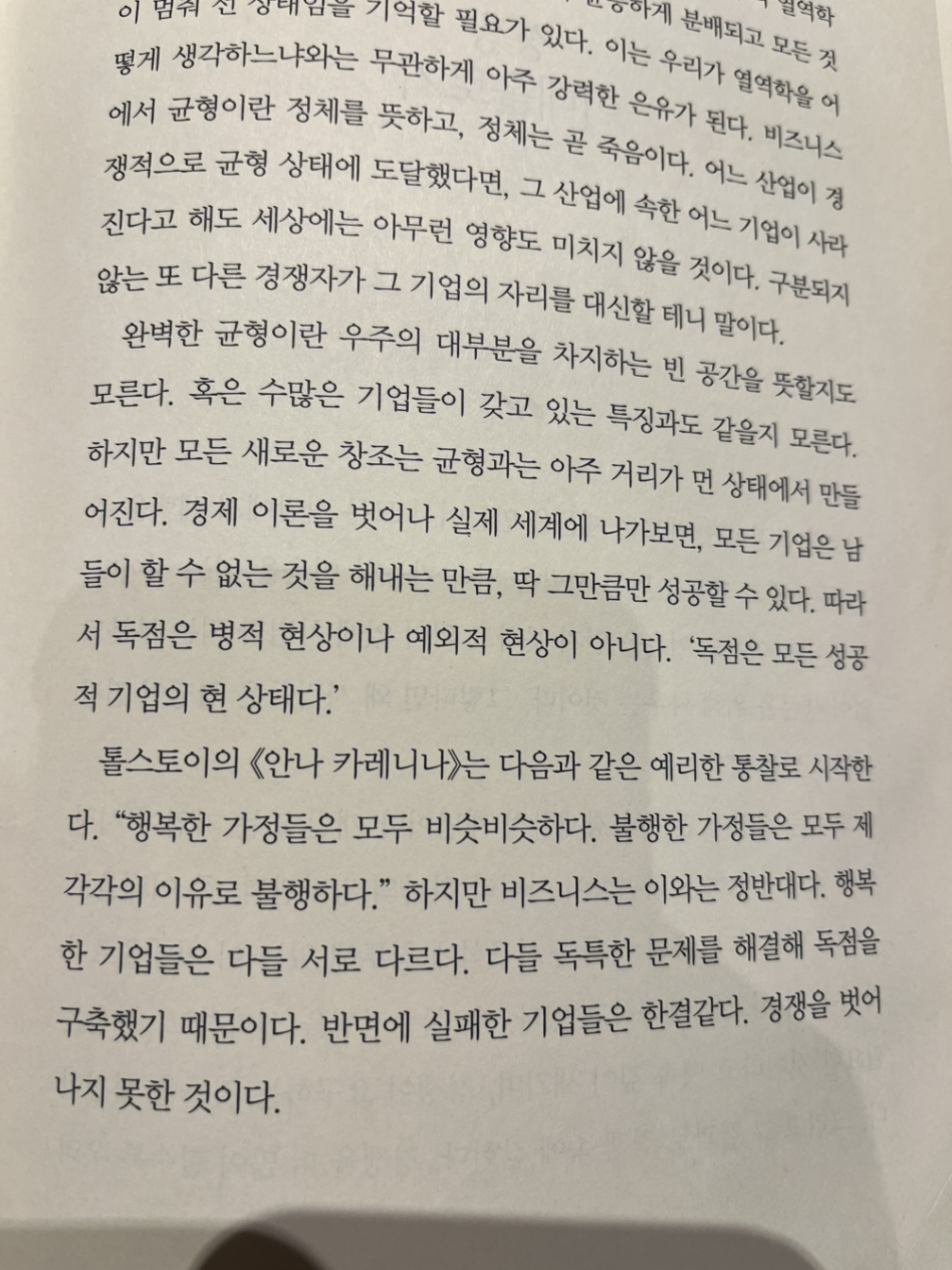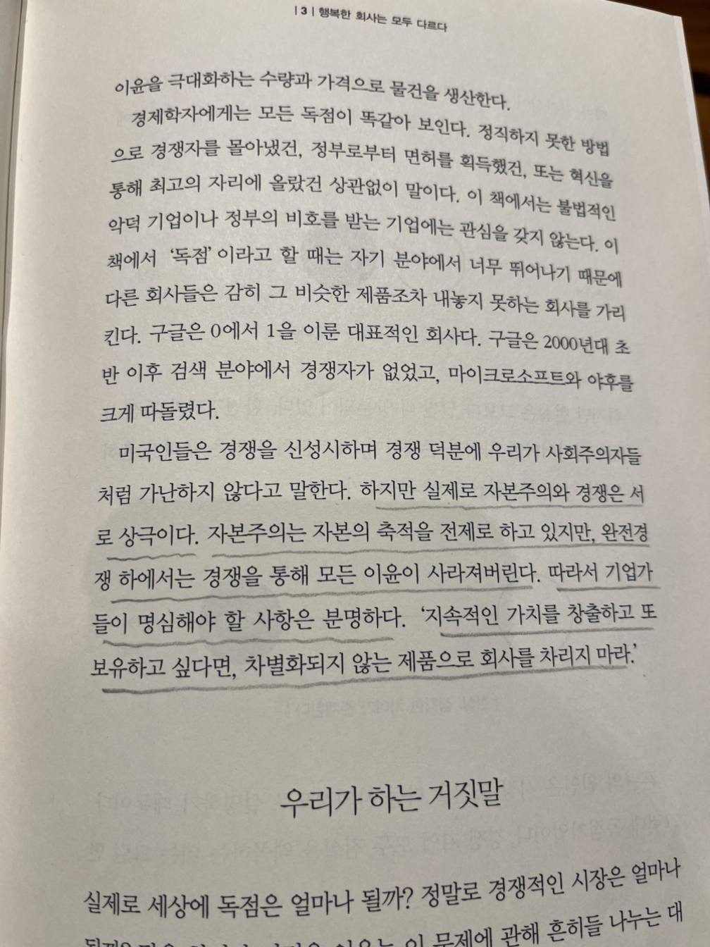 보통 교육 시스템과 사회는 경쟁을 미덕으로 가르치지만, 피터 틸은 "경쟁은 패배자들이나 하는 것"이라고 단언한다. 치열한 경쟁은 서로를 닮게 만들고 결국 이윤을 0으로 수렴하게 만든다. 진정한 승자는 경쟁 시장에서 살아남는 자가 아니라, 경쟁 자체를 피하고 자신만의 성을 쌓아 독점을 구축하는 자다.