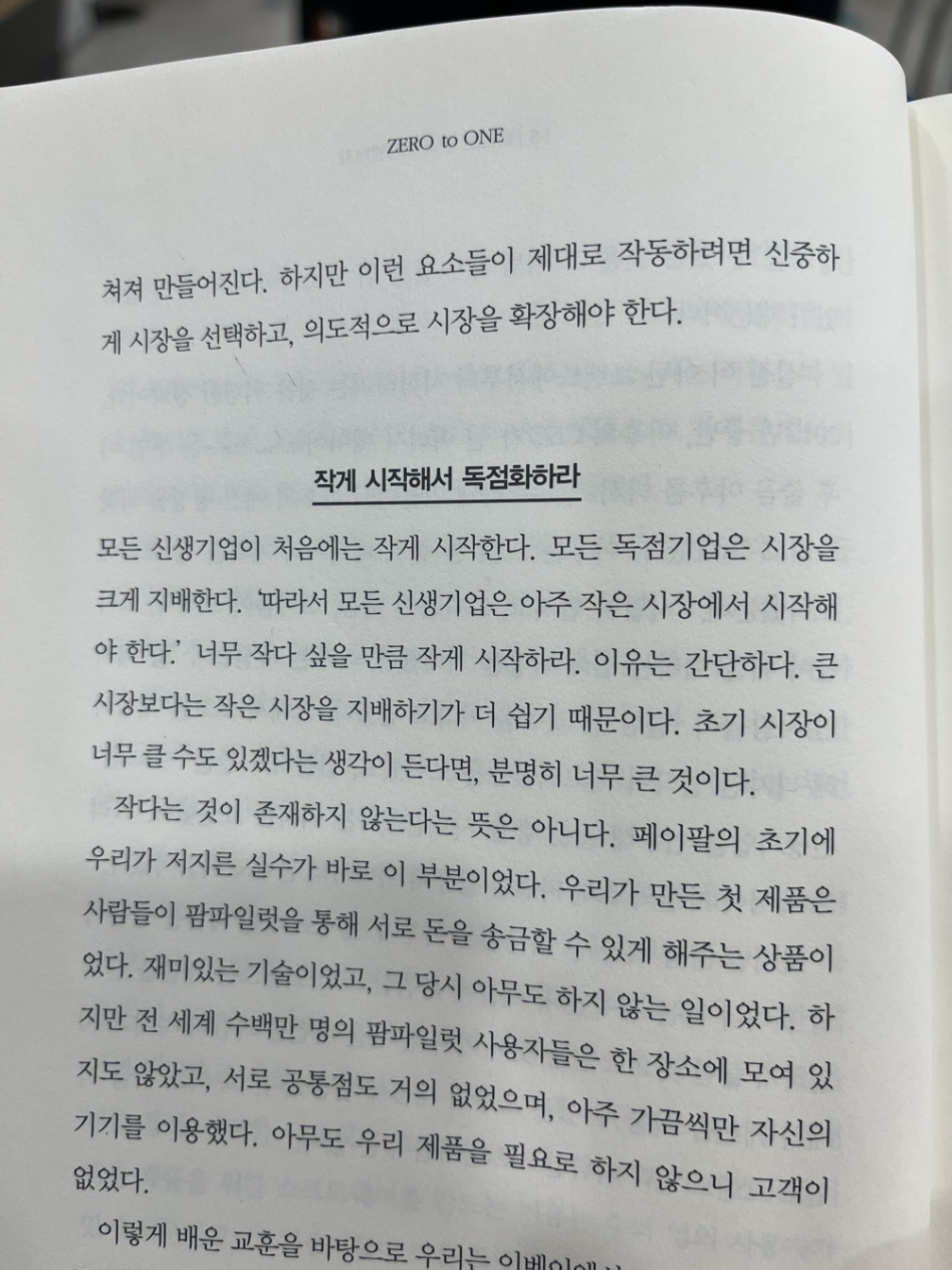 거창한 시장 점유율을 목표로 시작하는 것은 전형적인 실패의 길이다. 가장 효율적인 전략은 매우 작은 시장을 정의하고 그 안에서 압도적인 독점을 이루는 것이다. 페이스북이 하버드라는 작은 커뮤니티에서 시작해 세상을 장악했듯 니치 마켓을 완전히 장악한 뒤 그 지배력을 바탕으로 인접 시장으로 확장해 나가는 것이 제로 투 원의 핵심 공식이다.