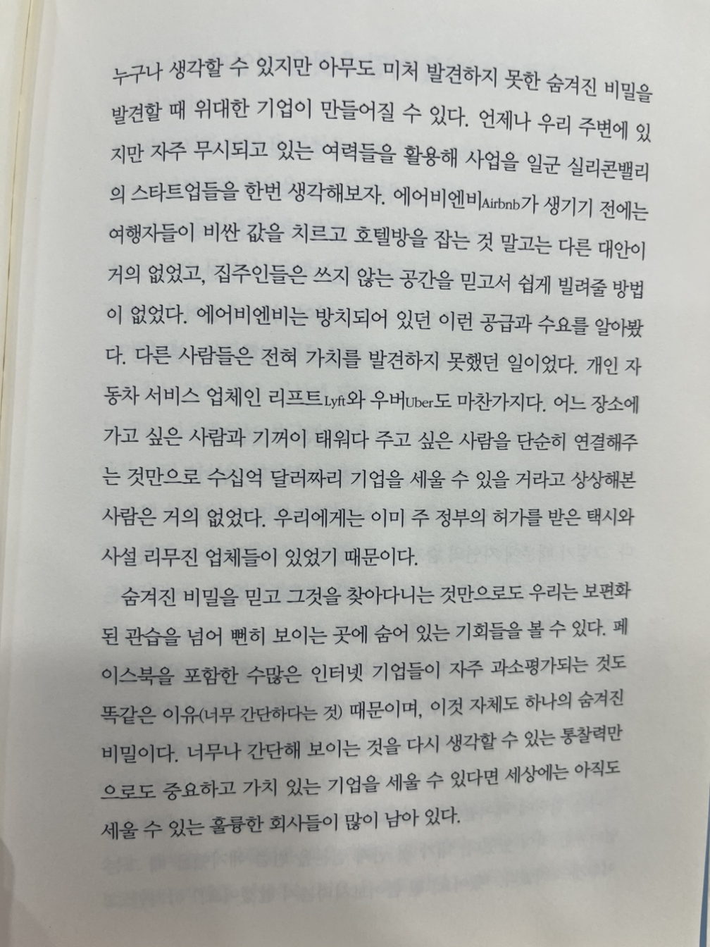 위대한 기업은 '남들은 동의하지 않지만 당신만 알고 있는 진실은 무엇인가?'라는 질문에서 탄생한다. 택시 산업이 이미 있지만 생겨난 우버와 리프트 처럼 통념에 저항하고 숨겨진 비밀을 찾아내어 그것을 사업화하는 용기가 결국 0에서 1을 만든다.
