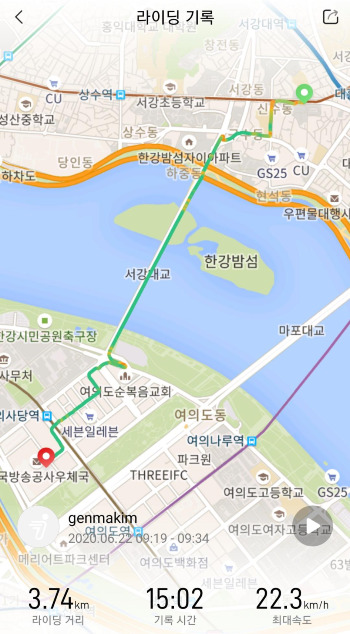 위 지도에서 보면 알다시피 이동 거리의 50%가 서강대교(길이 1.32km) 직선 코스다. 그래서 출근길에 큰 위험 요소는 없다. 차와 사람이 섞인 도로를 달려야 하는 경우도 별로 없고 한산한 길이어서 몸도 마음도 편안하다. 출근길 대부분이 한강을 달리는 길이기 때문에 경치도 좋고 기분도 상쾌하다. 창문을 열고 차로 다닐 때와 또 다른 상쾌함이다.
