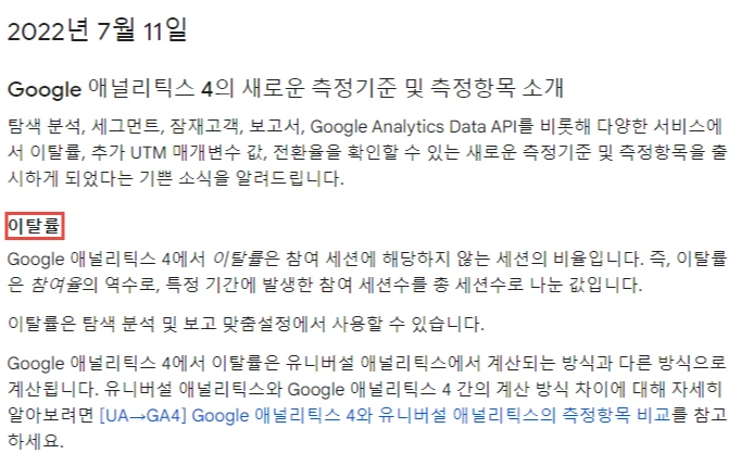 여기까지 기존에 주요하게 UA에서 사용하던 측정항목과 GA4에서 사용하는 측정항목의 차이점을 확인해봤는데요, 과거에 확인이 불가능했던 측정항목들이 업데이트되면서 GA4 내에서 확인할 수 있는 부분들이 추가되고 있는 점으로 보아, 지속적으로 구글에서도 사용자 의견을 바탕으로 GA4를 업데이트해나가고 있는 것으로 보입니다.