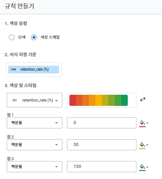 이후, 차트 생성 방법은 위와 동일하나 측정항목 지표로 ‘retention_rate(%)’를 선택하면 됩니다.