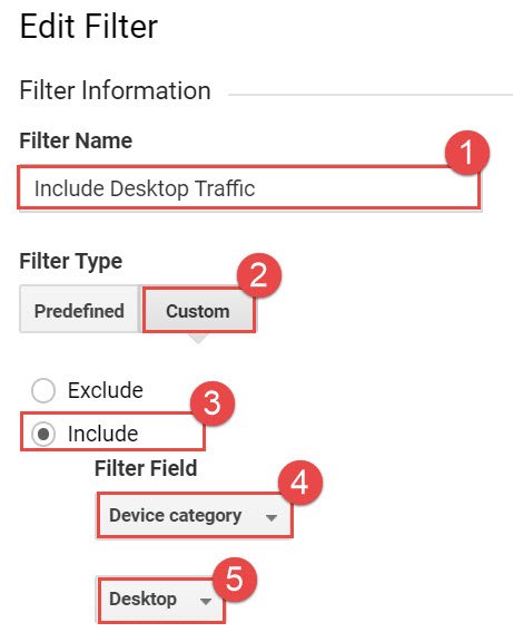 PC(Desktop) 트래픽만 포함하는 필터의 예시 화면입니다. 필터 이름은 Desktop 트래픽만 포함입니다. 타입은 Cutom 타입을 선택한 뒤 '포함'을 선택합니다. 마지막으로 기기 카테고리에서 Desktop(PC)를 선택합니다. 이렇게 되면 PC에서 접속된 트래픽만 보기(View)에 누적됩니다.