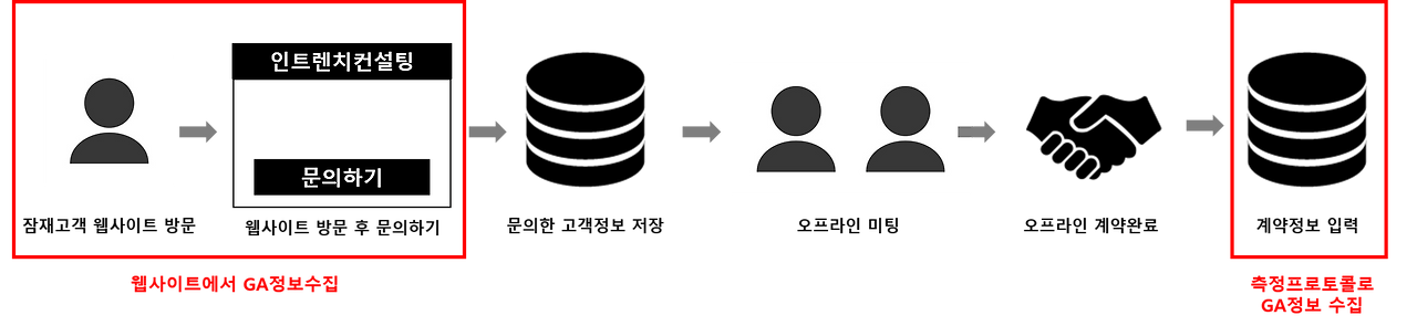 인트렌치 컨설팅을 예로 들어볼까요. 고객이 웹사이트 방문 후 고객정보를 남길 때 GA로 데이터를 수집합니다. 이 때, CID라 하여 쿠키 정보를 GA에 별도로 저장합니다. 그 후 미팅을 통해 최종 계약이 완료되면 성과를 내부 시스템에 입력할 때, 측정 프로토콜을 통해 GA로 데이터를 수집하는 프로세스입니다. 개발팀의 도움을 받게 되면 위 과정에서 발생하는 데이터를 자동으로 수집되게 할 수 있습니다.