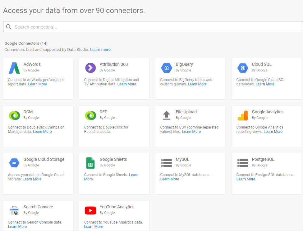애드워즈나 페이스북 데이터 역시 커넥터를 통해 연동할 수 있습니다. 무려 90개가 넘는 커넥터를 제공합니다. 반면에 GA는 종속된 보기에서만 데이터를 연결해야 하며, 다른 매체 데이터는 연동이 불가합니다. 따라서 대시보드를 유연하게 활용하려면 데이터 스튜디오를 써야 합니다.