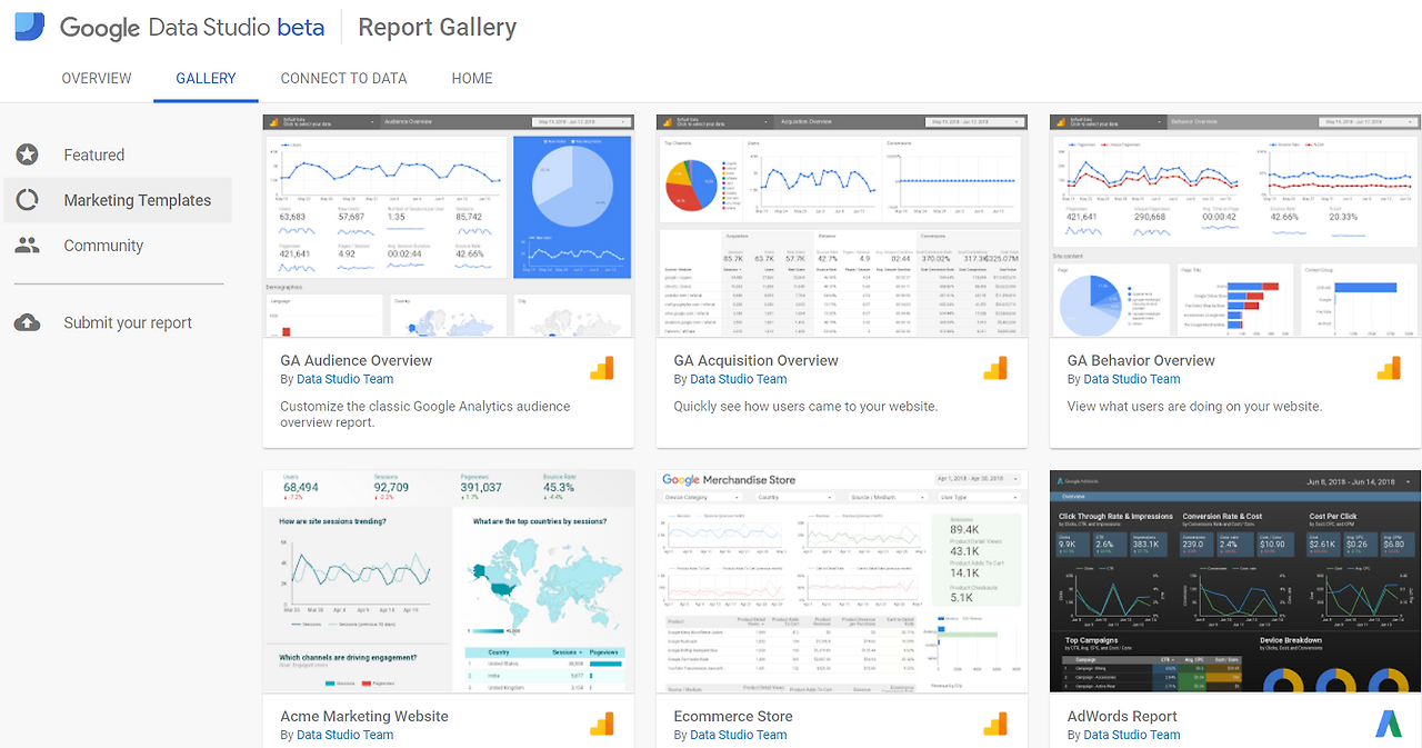 데이터 스튜디오는 다양한 마케팅 대시보드 템플릿을 제공합니다. 여러분께서 하실 일은 GA에 로그인하고 데이터를 연결만 하면 됩니다. 물론 약간의 편집 작업은 필요합니다. 여러 가지 템플릿의 위젯을 혼합해서 사용하면 디자인 감각이 없어도, 가독성이 높은 대시보드 설계가 가능합니다.