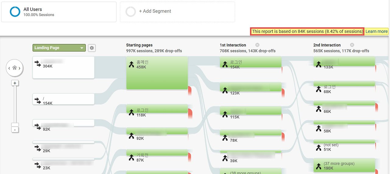샘플링을 적용되면 GA에서는 샘플링 비율이 표기됩니다. 위 그림의 오른쪽 상단을 보세요. 노란색으로 샘플링 비율이 표기되고 있죠. 전체 세션에서 약 8.4% 데이터를 가지고 행동 흐름 보고서를 보여주고 있습니다. 구글 애널리틱스 프리미엄(유료)을 사용하면 샘플링이 될 확률이 낮아지긴 하지만, 그렇다고 해서 샘플링이 걸리지 않는 건 아닙니다. 다시 말해, 유료를 사용해도 샘플링에서 벗어날 순 없습니다. 무료와 유료 제품의 샘플링 기준치는 아래와 같습니다.