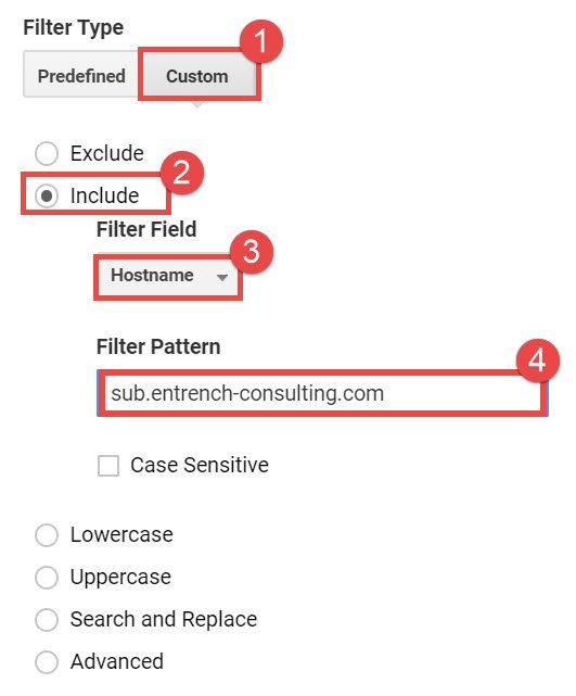 그러면 필터링된 데이터가 수집되므로 샘플링이 걸릴 확률이 줄어듭니다. 물론 세그먼트나 맞춤 보고서로 조회하는 경우 샘플링은 걸릴 수 있지만, 가능성이 확실히 줄어듭니다. 위 그림은 서브 도메인 트래픽만 유입되도록 보기 필터를 적용한 예시입니다. 저렇게 설정하면 'sub.entrench-consulting.com' 도메인으로 시작하는 데이터만 수집이 됩니다. 따라서 서비스의 일부 데이터만 수집되므로 샘플링이 걸릴 확률이 낮아집니다.