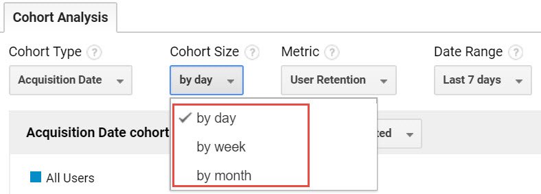 주의하실 점은 데이터를 조회할 때 서비스 도메인에 맞는 동질 집단 크기(Cohort Size)를 선택해야 합니다. 여기서 도메인이란 산업 혹은 서비스의 특성을 의미합니다. GA에서 조회할 수 있는 동질 집단 크기는 '일/주/월'을 선택할 수 있습니다. 만약 여행 서비스라면 일간 단위로 재방문을 체크해서는 안 됩니다. 일반적으로 여행 웹사이트는 여행을 가기 2~3달 전에 방문해서 상품을 조회하기 때문인데요. 때문에 여행 서비스는 주간 혹은 월별 단위로 데이터를 조회해야 합니다.