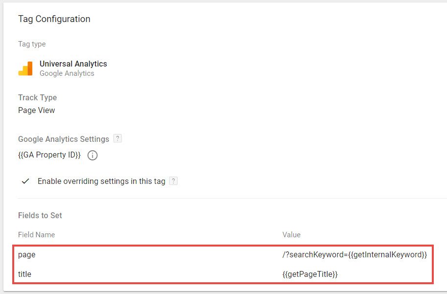 위와 같이 설정하면 GA로 가상 페이지뷰를 전송하게 됩니다. GA는 가상으로 수집된 페이지 URL에서 검색어 변수를 인지하게 되며, 검색어 보고서에 해당 데이터를 보여줍니다. 내부 검색어를 얻으려면 맞춤 HTML 변수를 선택하여 직접 코딩을 해야 합니다. 개발팀 도움이 필요해요.
