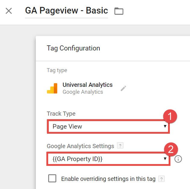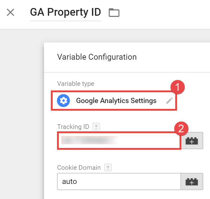 구글 태그 매니저 접속 후 사용자 변수를 생성하고 구글 애널리틱스 세팅 유형을 선택하세요. 여러분이 관리하는 GA 속성 ID를 아래 그림의 Tracking ID 필드에 입력합니다. 속성 ID는 GA 속성 설정에서 확인 가능합니다.