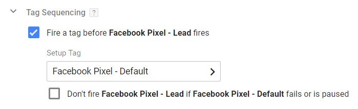 전환 픽셀은 기본 픽셀보다 항상 뒤에서 실행돼야 합니다. 구글 태그 매니저를 사용하지 않고 소스 코드를 직접 넣는 경우에도 마찬가지입니다. 구글 태그 매니저는 태그 실행 순서 처리를 할 수 있게 태그 시퀀싱 기능이 있습니다. 체크 박스 한 번으로 태그가 실행되는 순서를 정의할 수 있습니다.