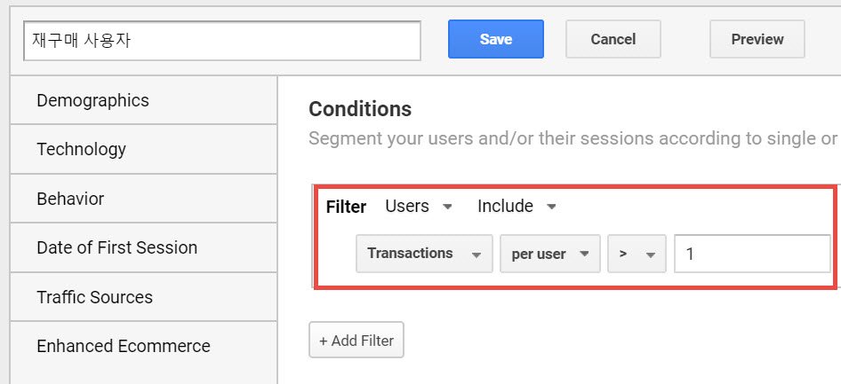 재구매 사용자는 GA로 어떻게 조회할 수 있을까요? 사용자당 거래수가 1보다 커야 합니다. GA는 다양한 조건의 사용자 특성을 세그먼트로 생성할 수 있습니다. 일반적으로 회원의 등급은 특정 기간의 구매건수에 따라 분류됩니다. 만약 등급 체계가 구축되지 않은 상태라면, 구매 건수에 따라 회원의 등급을 분류하시기 바랍니다. 이를테면, 3개월 안에 구매 건수가 5회 이상이면 VIP 등급으로 보는 식입니다.