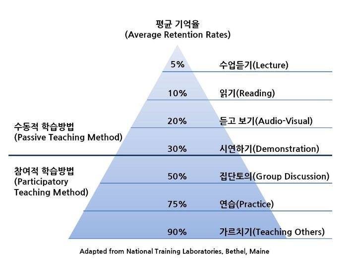 저희 회사에 계신 분이 공유해주신 그림인데요. 개인적으로 상당히 인상 깊었습니다. 솔직히 명강사의 수업을 듣는다고 강사가 전달한 내용을 100% 소화하는 사람은 없습니다. 컴퓨터가 아닌 이상 그런 사람은 흔치 않습니다. 뇌는 기억하는 척 하지만 다음 날이 되면 다시 이전 상태가 되는 경우가 많은 것 같아요. 저 역시 그렇습니다. 위 그림을 보면 기억을 높이는 가장 효과적인 방법은 연습을 하거나 남에게 본인이 학습한 내용을 가르치는 것이라 합니다. 아무리 책을 읽고 온라인 강의를 반복해서 수강해도 효율은 높지 않다는 얘기입니다.