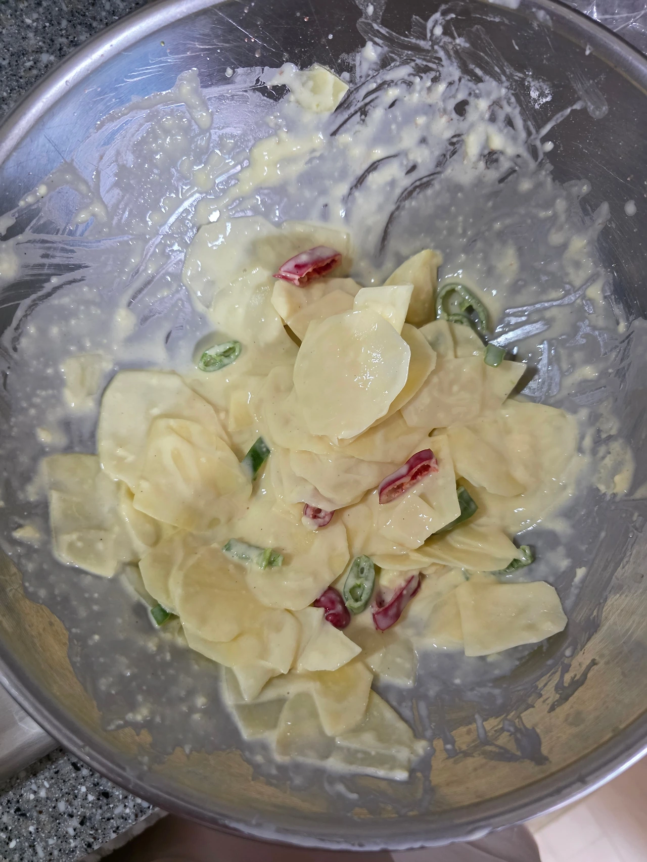 감자를 얇게 썰고, 부침가루에 고추를 넣어 색도 맛도 살짝 매콤하게.