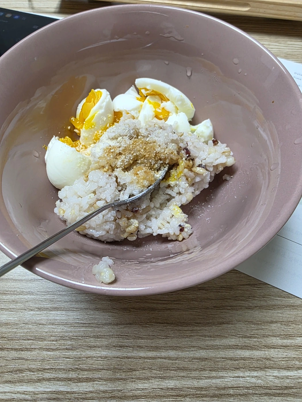 삶은 계란 두 개 잡곡밥 간장 조금 이렇게 비벼서 간단하게 먹는다