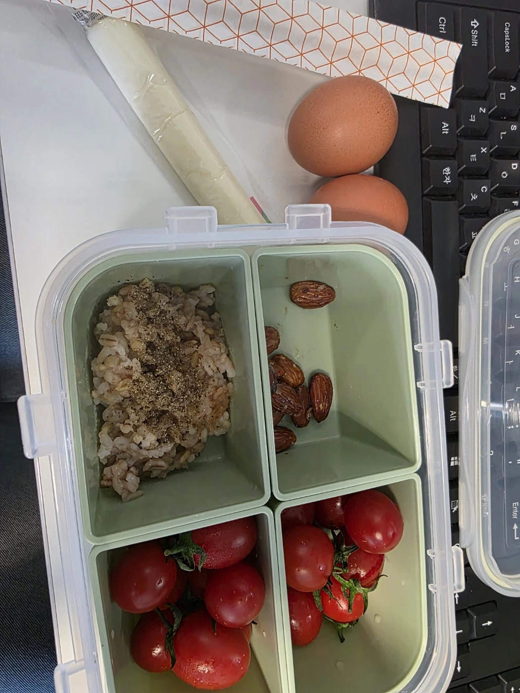 이거는 나의 점심 도시락이다 방울토마토 아몬드 밥 조금 삶은 계란 두 개 스트링 치즈 아주 든든하다