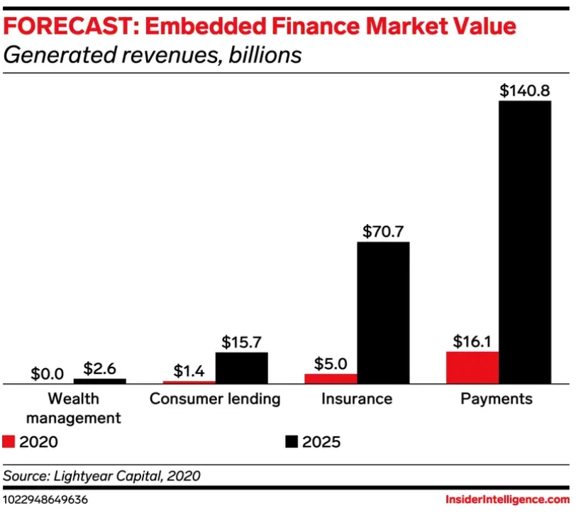 비금융회사가 본업을 하면서 관련 금융상품과 서비스를 함께 제공하는 것, 금융회사가 비금융회사를 통하여 상품을 유통하는 것을 임베디드 금융(Embedded Finance)이라고 한다. 기술의 발달로 금융서비스가 언번들링 되면서제휴만으로도 특정 금융기능이 전자상거래와 같은 플랫폼에서도 가능하게되었다.