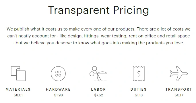 미국 의류회사 Everlane은 제조원가와 제조과정을 투명하게 공개하는 것으로 유명하다. 벤처캐피탈에 근무중이던 Michael Preysman이 패션업계의 폭리를 참지 못하고 설립한 기업이라 Radical Transparency, 급진적인 투명성을 내세운게 특징이다.