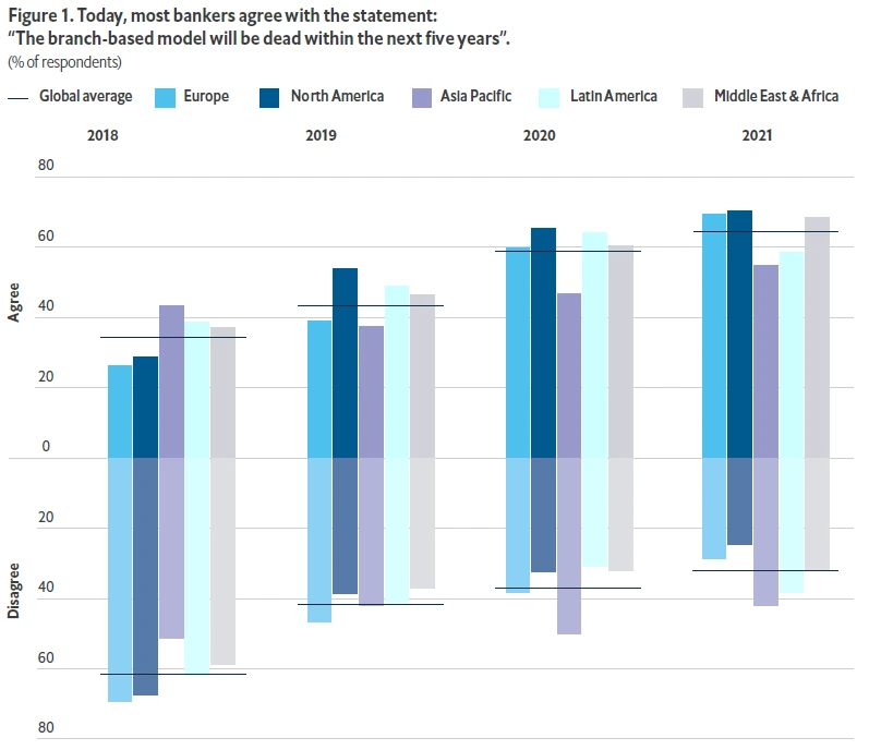 이코노미스트 인텔리전스 유닛(EIU)에 따르면 은행의 지점 기반 모델은 5년내에 죽을 것이라는 데에 65프로가 동의했다. 4년전 35프로였던 수치가 팬데믹 기간을 계기로 오프라인 지점에 대한 니즈가 확연히 떨어진 것 같다. 아니 반대로 디지털 채널에 대한 수요가 급증한 것으로 봐야겠다.