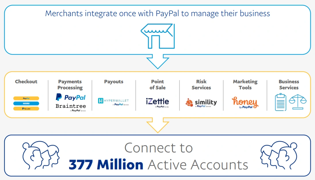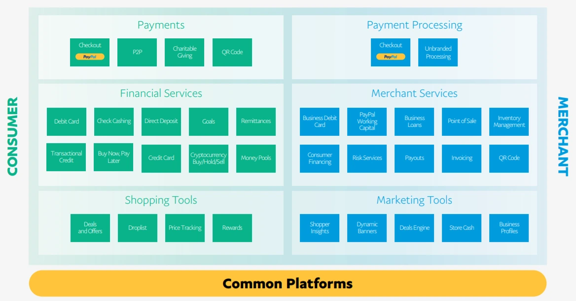 페이팔이 올해 2월 Investor Presentation에서 보여준 바와 같이 디지털 금융을 위해 소비자와 판매자를 위한 종합 플랫폼을 지향하고 있다. 소비자 측면에서 결제, 금융서비스, 쇼핑 툴을 신경써야하는 것처럼 판매자 측면에서는 결제 프로세스, 비즈니스를 위한 서비스, 마케팅 툴을 고려해야 한다.