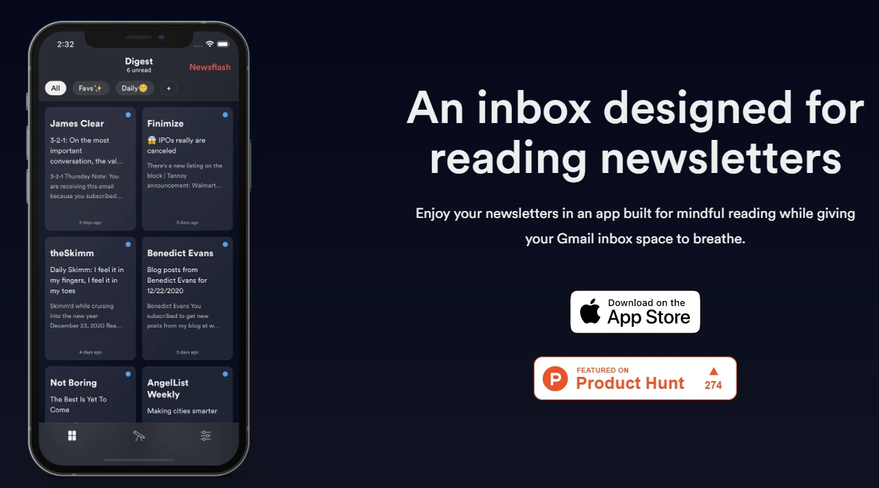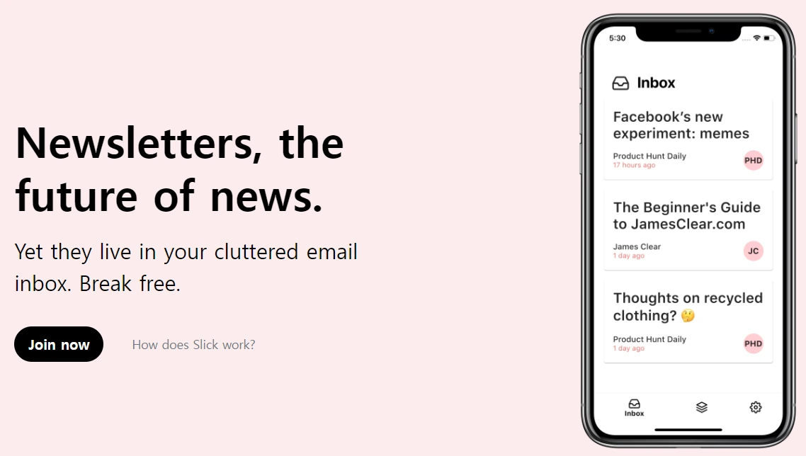 나만 몰랐던 사실인가! 또 급히 찾아봤다. (검색하면 끝도 없지만, 일단 난 다 찾아본다.) 몇가지 소개하자면, Slick Inbox, "Declutter your email inbox." 이 한마디가 바로 내가 원하던 바다. 아. 속이 시원하네. 나만 그런게 아니다. 이메일에 뉴스레터 꽉찬 사람이 많았고 다들 원했을거다. 수신되는 이메일과 뉴스레터가 섞이지 않고, 이 앱에서 다 볼 수 있다.