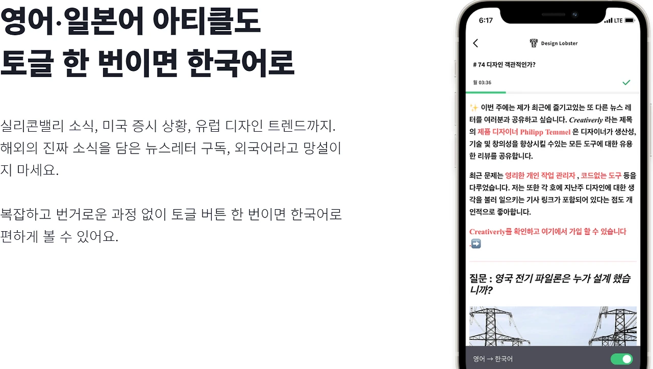 헤이버니의 차별화 기능은 번역이다. 해외뉴스레터도 하단에 있는 토글 버튼 한번 클릭하면 번역이 되어 편하게 볼 수 있다. 해외 뉴스레터도 볼 때마다 시간이 좀 걸렸는데, 번역해서 보면 시간이 좀 절약되지 않을까 하는 생각으로 여기에서 등록했더니, 오 신기하네. 구글 번역 아닌가 했는데, 헤이버니를 만든 트위그팜은 딥러닝 기반의 자연어처리 전문기업으로 번역쪽에 특화되어 있었다. 오, 멋진데.