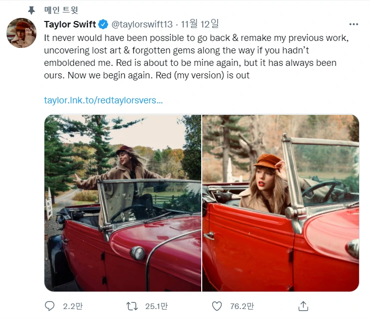 11월12일 Taylor Swift의 Red(Taylor's Version)가 발매되었다. 올해 4월 Feerless를 시작으로 그녀는 자신의 과거 앨범을 다시 녹음해서 발매하고 있다. 그 이유는 기존의 앨범을 대체하기 위해서인데, 여기에는 창작자의 권리와 기존 관행사이 실타래같은 이해관계가 엮여있다.
