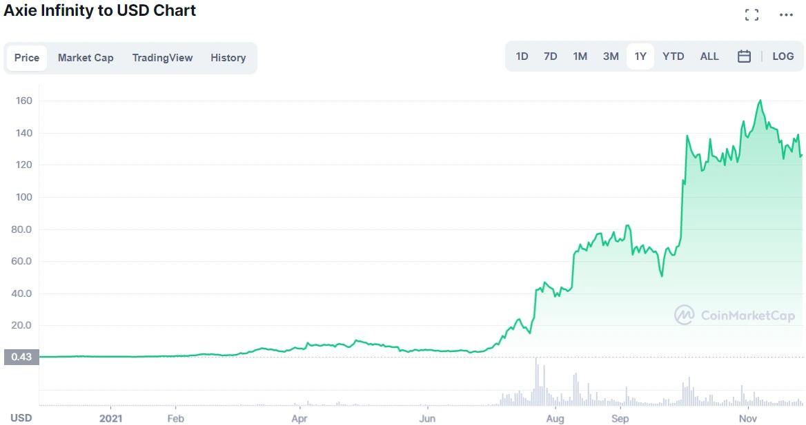 그런데 Axie Infinity의 거버넌스 토큰인 AXS(Axie Infinity Shards)는 여전히 흥행중이다. AXS 홀더는 Axie Infinity와 관련된 투표권을 행사할 수 있고, 향후 수수료 수익을 보유량에 맞춰 배분받을 수 있다. 참고로 Axie 게임을 만든 Sky Mavis가 약 20%를 소유하고 있다. 올해 메타버스, P2E 트렌드로 인해 이 게임에 대한 기대감이 상승하면서 AXS는 그 어느때보다 높은 가격을 형성하고 있다.