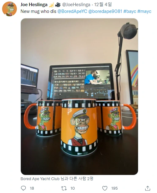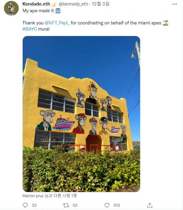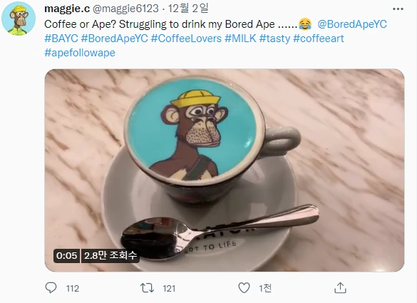 NFT 소유자는 해당 IP 오너쉽을 갖는다.BAYC 소유자들이 올리는 트윗을 보면 각종 티셔츠, 머그컵, 스케이트 보드, 자동차, 심지어 라떼아트까지 자기가 소유한 BAYC 이미지를 공유하며 즐기고있다. 자신이 가진 NFT이미지를 오프라인 세상에 복제하며 놀고 있는 이들의 모습을 보면, 이미 BAYC는 웹3.0시대의 대표적인 브랜드가 된 것 같다. 밈 NFT에서 더 나아가 밈 브랜드가 된 듯한 느낌이다.