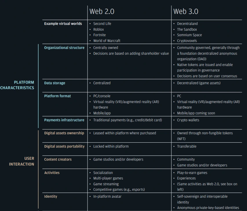 JP모건 보고서에는 메타버스를 웹2와 웹3으로 구분했고, 세컨드라이프, 로블록스, 포트나이트를 웹2의 가상세계로 본다. 웹3의 가상세계는 '공간'개념이 들어간 가상 부동산 플랫폼- 디센트럴랜드, 더 샌드박스, 솜니움 스페이스, 크립토복셀을 꼽았다. 즉, JP모건은 웹3의 가상세계에서 금융을 지원하는 금융회사 역할을 하겠다는 것이다.