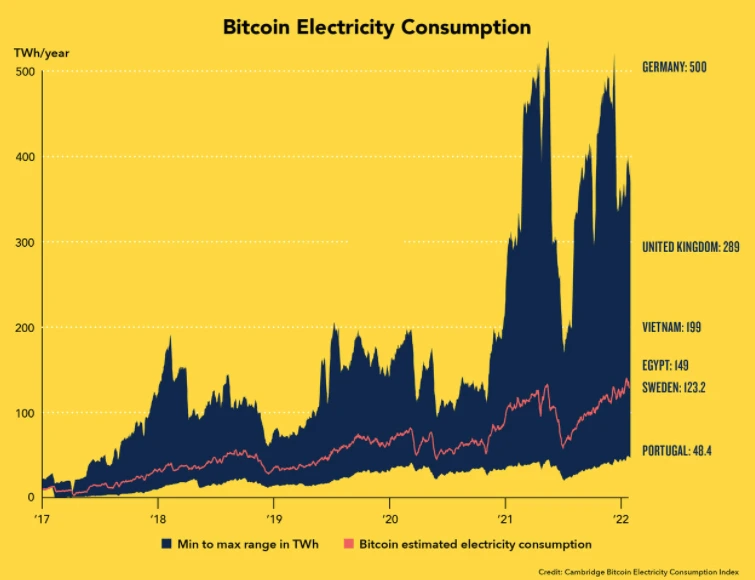 단 한번의 비트코인 거래에 필요한 에너지가 미국의 일반적인 가정에 70일 이상 전력을 공급할 수 있는 양이며, 비트코인 채굴 전력 소비가 2019년에서 2021년 사이에 3배 이상 증가하여 덴마크, 칠레, 아르헨티나 국가의 에너지소비와 맞먹는다고 하니, 덮어둘 문제가 아니다.