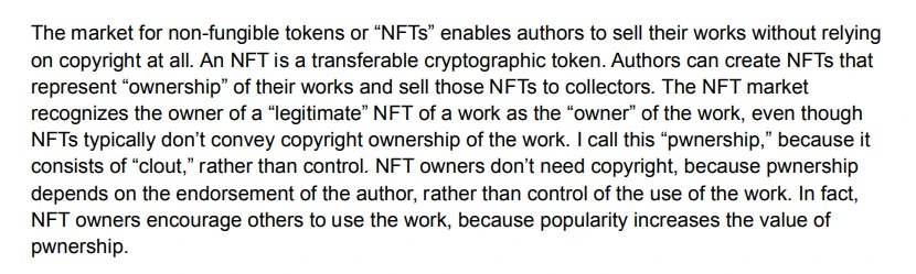 NFT는 양도 가능한 암호화 토큰이다. 작가는 자신의 작품에 대한 '소유권'을 나타내는 NFT를 만들고 수집가에게 NFT를 판매할 수 있다. NFT 시장은 NFT가 일반적으로 저작물의 저작권 소유권을 전달하지 않음에도 불구하고 저작물의 '적법한' NFT 소유자를 저작물의 '소유자'로 인식한다. 나는 이것을 'pwnership'이라 부르는데, 이는 통제가 아니라 '영향력'으로 구성되어 있기 때문이다. NFT 소유자는 저작권이 필요하지 않다. 왜냐하면 저작권은 저작물의 사용에 대한 통제가 아니라 저자의 승인에 달려 있기 때문이다.사실 NFT 소유자들은 다른 사람들이 저작물을 사용하도록 부추긴다. 왜냐하면 인기가 pwnership의 가치를 높이기 때문이다.