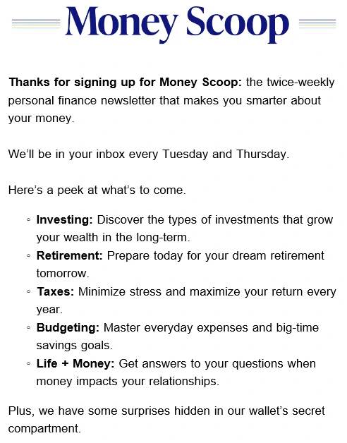 Money Scoop 이메일 구독을 신청하고 나니, 매주 화/목요일에 투자,은퇴,세금,예산,사례 등 5가지 콘텐츠로 뉴스레터를 보내주겠다는 내용이 담긴 웰컴 이메일이 메일함으로 수신되었다.