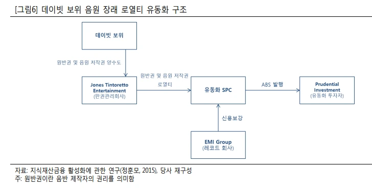 데이비드 풀먼의 인터뷰를 보면, 유동화 구조의 복잡성이 아닌 자산(asset)이 복잡하기 때문에 따라하기 쉽지 않을거라고 이야기했다. 그 복잡성은 지식재산권에 수반된 권리관계와 그 권리를 소유하고 있는 저작권자, 그리고 그에 따른 현금흐름이 해당된다고 보여진다.