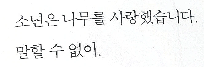 하지만 지금은 조금 더 깊게 고찰을 할 수 있게 된 것 같다. 소년은 어린 시절 가지고 있었던 순수함과 세상을 아름답게 볼 수 있는 낭만을 잃어버린 사람을 상징하는 듯하다. 반면 나무는 변함없이 어린 시절의 순수한 사랑과 아름다움을 지켜내는 존재가 아닌가 싶다.