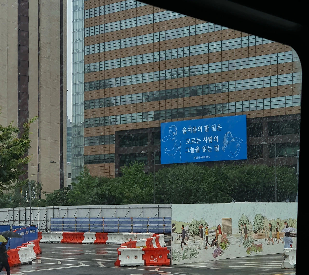 어느 늦은 여름, 버스를 타고 가다 옥외간판에 [올여름의 할 일은 모르는 사람의 그늘을 읽는 일]이라고 쓰인 글귀를 발견했다. 와닿는 문구라 버스가 지나치기 전 얼른 사진으로 찍어두었다.