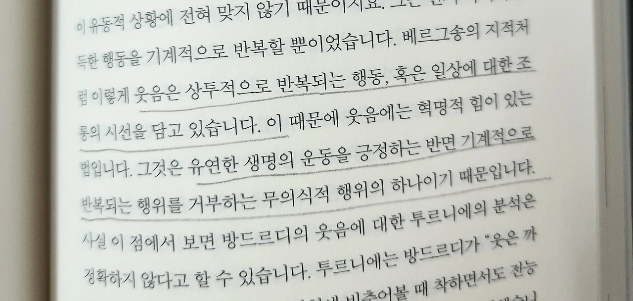 261. 베르그송의 지적처럼 이렇게 웃음은 상투적으로 반복되는 행동, 혹은 일상에 대한 조롱의 시선을 담고 있습니다. 이 때문에 웃음에는 혁명적 힘이 있는 법입니다. 그것은 유연한 생명의 운동을 긍정하는 반면 기계적으로 반복되는 행위를 거부하는 무의식적 행위의 하나이기 때문입니다.