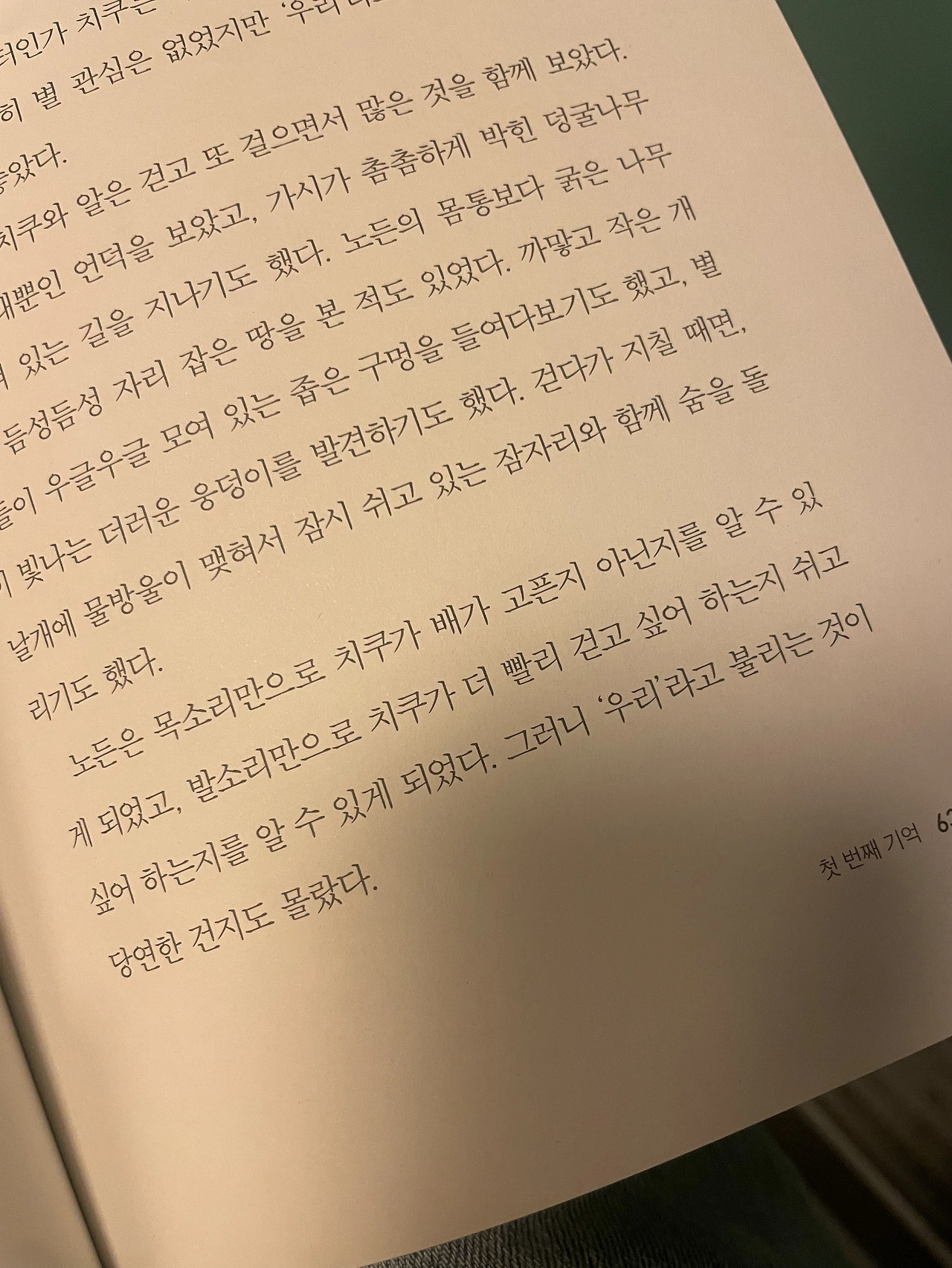 그럼에도 나는 절대로 어떤 종이 됐든 간에 동물을 키우고 싶지 않다. 거대 거북이가 아닌 이상에서야 언젠가는 반드시 나보다 먼저 그를 떠나보내줘야 하기 때문이다. 나는 죽음이 두려운 사람. 무서운 사람. 채니와 죽음에 관하여도 이야기를 나눴다. 스물두 살에 갑자기 처참한 사고로 죽어버린 친구 이야기, 스물여섯에 갑작스럽게 얻은 병으로 떠난 한 작가님의 이야기. 두 사람 모두 성실하고 착한 사람이었다. 반짝반짝 빛나는 사람이었다. 나는 아직 극도로 죽음을 두려워하고 있는 반면에 많은 죽음을 겪은 채니는 어찌 조금 의연해 보였다.