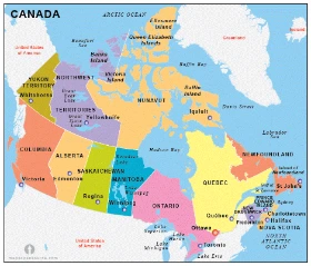 캐나다 지도를 보며, 서쪽 끝부터 비시 B.C.(British Columbia), 앨버타 Alberta, 사스캐츠완 Saskatchewan, 매니토바 Manitoba와 온타리오 Ontario가 차례대로 늘어서 있고, 그 동쪽으로 퀘벡 Quebec, 뉴펀들랜드 Newfoundland, 뉴브런즈윅 New Brunswick, 프린스 에드워드 섬 Prince Edward Island과 노바 스코시아 Nova Scotia까지 모두 열 개의 주(Province)가 있고, 그 북쪽으로 북극해 Arctic Ocean에 맞닿아 있는 유콘 Yukon, 노스웨스트 Northwest, 누바벗 Nunavut의 세 개의 준주(Territory)가 있다.